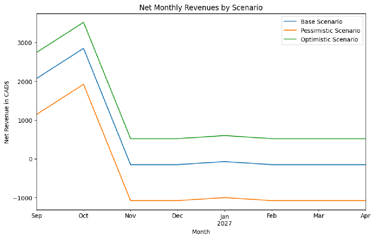 The notebook consists of cost, revenue, and net dataframes for base, pessimistic, and optimistic forecasts. In total, there are 9 such, ‘core’ dataframes. Costs are categorised largely according to the UofT Financial Planner. So too are revenues. I estimated OSAP and UTAPS grants and loans, and zeroed scholarships and family support for simplicities sake. My main revenues aside from these are: summer work, expressed as a starting balance added to my running balance in the net dataframes; part-time work, expressed as a constant revenue source. More on these later.